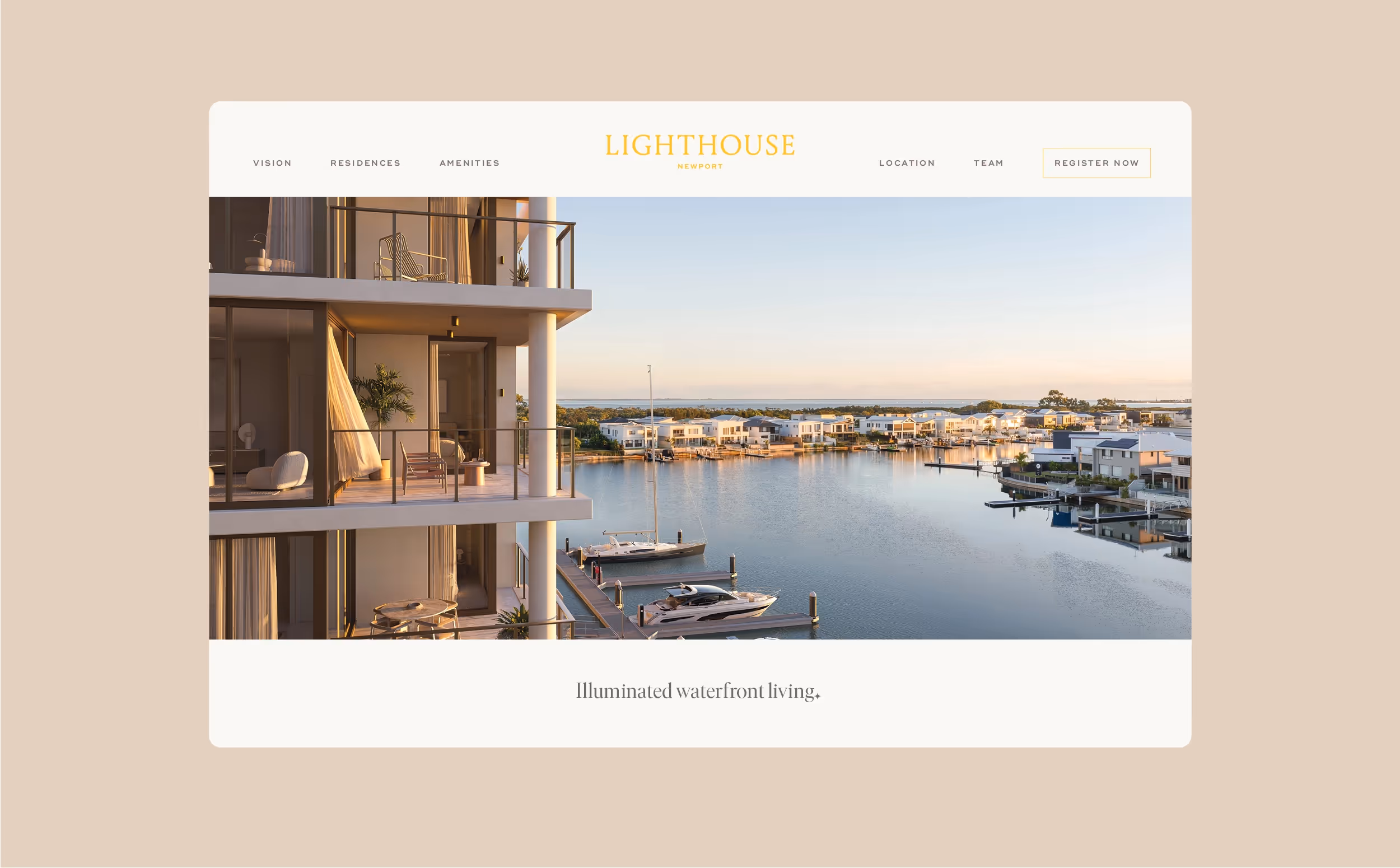 Lighthouse is a development that shines brightly in the minds of its audience. More than just a development, it's a beacon on the Newport waterfront, drawing interest from beyond the area with the promise of an elevated, comfortable lifestyle by the water. For the local community, Lighthouse signals a fresh chapter filled with optimism, excitement, and new possibilities, setting the tone for a brand built on light, warmth, and aspiration. Its visual identity reflects this guiding spirit; illuminated, confident, and distinctly coastal. Light-filled and uplifting, the saturated Palm Springs–inspired palette is a nod to the aesthetic of the neighbourhood. Subtle nautical cues and bright pops of colour inject energy. Lighthouse is a place where everyday life feels elevated, yet relaxed. A refreshing new perspective on waterfront living.